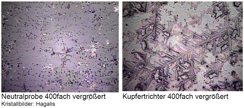 Die Kristalle entstehen dabei aus der Extraktion des Destillatrückstandes, der zuvor verascht und calciniert wurde. Diese Kristallsalze werden mit dem Destillat vereinigt und auf Objektträger aufgebracht. Die Flüssigkeit wird bei Raumtemperatur zur Verdunstung gebracht. Dabei entstehen jederzeit reproduzierbar den Proben typisch zugeordnete Kristallbilder, die eine Aussage über die Qualität der Lebenskräfte der Proben erlauben.