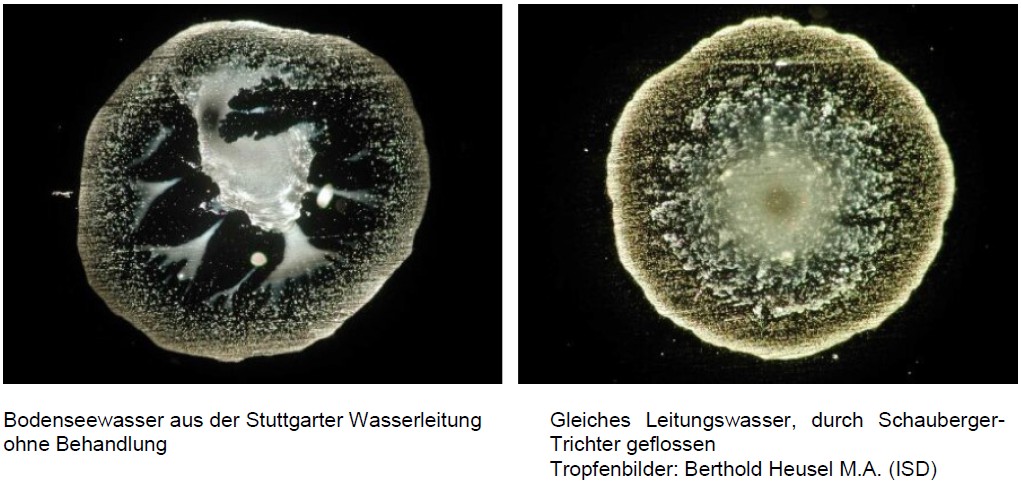 Störende Einflüsse auf das Wasser z.B. durch die Art der Leitungs-führung oder die Materialien der Rohre werden durch die Wasser-verwirbelung „gelöscht“. Gleichzeitig bekommt das Tropfenbild des Wassers eine größere Ähnlichkeit mit Quellwasser. Durch die Verwirbelung scheint also eine ursprüngliche Strukturtendenz verstärkt zu werden bzw. sich zu regenerieren.